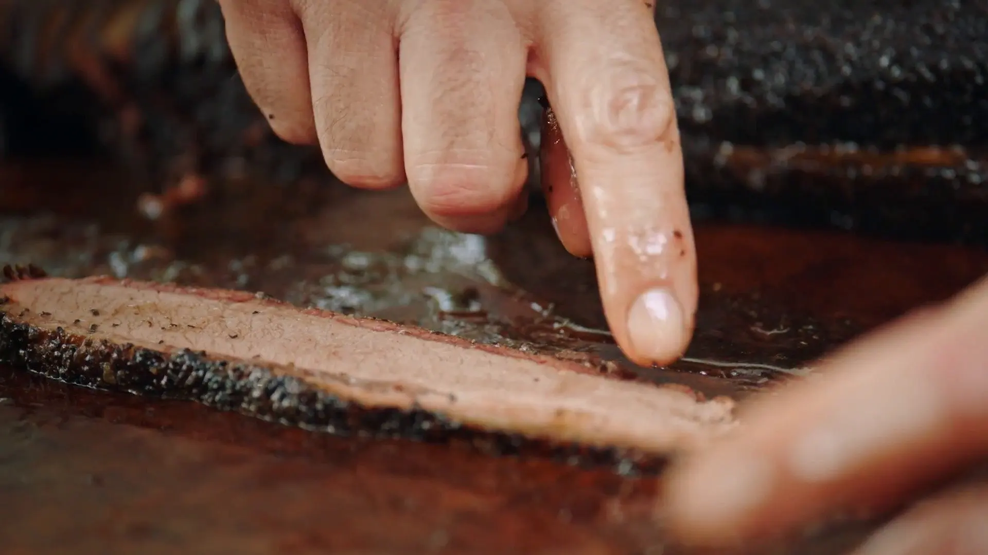 [MUSIC PLAYING] - So I've been hanging out all night watching this thing cook. I think it turned out pretty good. It's looking really nice so far. Feels really cool to the touch. I'm going to tempt it. And it is-- So I'm going to use the same whole back here. We'll see what it's looking like. It's a 165. It's a little bit hot. But we're going to talk about it for a while. So that's OK. I just want to open it up and have a brisket sitting on the counter. So kind of know where you're going with it. And I know I'm going to do an n-cut right there. I'm going to cut it right there, slice out about like this, and then I'm going to start slicing that way. So traditionally, you want to curl your knuckles for cutting things. You cut stuff. You kind of do that. Briskett's not really like that. It's more maybe like if you're watching a sushi chef cut fish. You kind of use your hands a lot, use your blade. You want to just kind of carve your way through it. It's kind of like playing pool. If I hold my thumb like that, I can always use that technique to kind of guide the knife, too. So a lot of times at the restaurant if I'm talking to someone, like, hey, how's little Jimmy, how's his braces, I can just kind of cut my way by feel. I don't really have to look and see what I'm doing. Back to the way that we season this thing, we were careful with the seasoning. We were careful with the trim. We spritz the edges. We kept the fire low throughout the cook. And now it's time to really find out if any of that stuff actually works. Hopefully, it did. I think it's going to be pretty OK. It feels really nice. So I think it's time to unwrap it. All right, so let's inspect our handiwork. That's what we're talking about. So this is kind of like the final reckoning for this brisket. I like to keep all this juice on the board as I'm cutting it. This is the fat that rendered out after we wrapped it. This is the stuff that reabsorbs. It feels great. It's pliable. You can see the fat kind of move around right in here. I think this is-- I'm pretty happy with this. So as you're pulling this before it's out of the bag, when it's on the cooker, I've got the towel going through it. I've got my fingers. I'm trying to find-- I'm trying to visualize how the fibers feeling there. And that takes a lot of experience. It takes a long time to get there. Or at least it took me a long time to get there. But there is kind of another way. You open it up. You can always check on the bottom side. And this is kind of a cool trick. If you really want to know, you can just kind of go through and poke around a little bit. This is where that seam fat is that we're going to cut out later. You can see the fibers they want to pull apart. Obviously, this is very tender. But you can kind of poke around with a toothpick. Over here feels pretty good, feels pretty good going in there. And if you really want to pull it apart, if you're in a good place te...