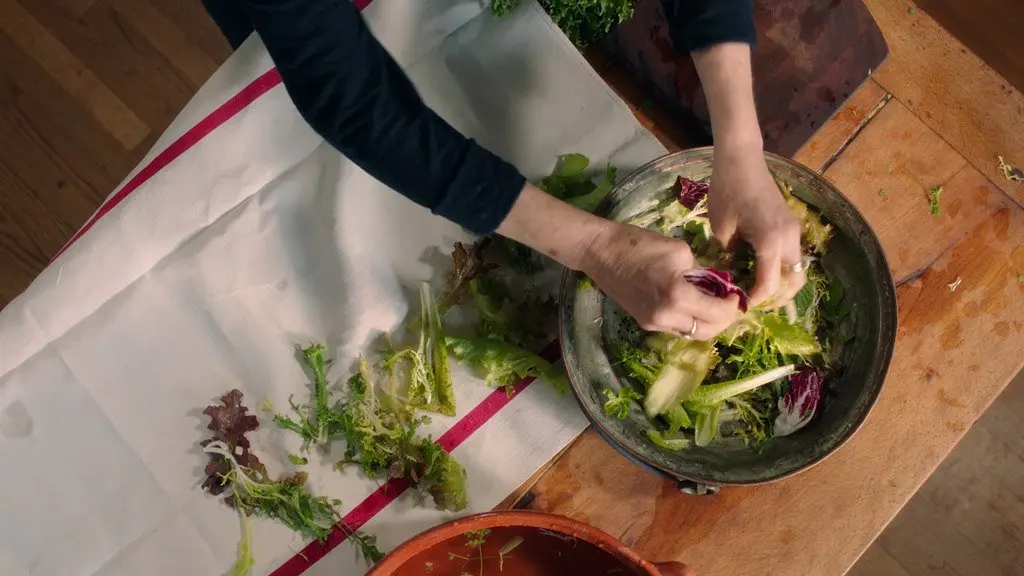 When I was in France the first time, you go to the market and you'd see a big tablecloth almost, with a mix of salads about this high. And my friend Martine, would just take handfuls of that, she'd bring them home, and she made a dressing out of anchovies and garlic. And in that salad were things like this rocket. I have little tiny rocket that I have here, and chervil, which all of these have very strong distinctive tastes. It always had a little frisee in it, as well, sometimes dandelion greens. But it was the salad that the farmer just picked as he walked down the rows. And so, it could even have some red oak leaf in there. I think of it as a Chez Panisse mesclun salad because I brought so many seeds home from France that, at the beginning, I didn't know where I was going to plant them. And then, I had this idea, why don't I just turn the backyard of my house into a mesclun salad garden and we could really have the real salad at Chez Panisse. And I did that. It's a kind of salad that you can cut it, and then, it grows again. It's an intensive use of space. The amazing thing about cut-and-come-again lettuces is that you can harvest their leaves several times before they become tough or bitter. Then, there's this little speckled salad. Again, a European varietal that we started planting. And I now include that in my own personal mesclun mix and radishes. Sometimes, for the first course at the restaurant, we might have just a little bouquet of radishes and some butter, just like the French do, a little coarse salt. It's really great to have these secret things in the garden that children can plant. And when Fanny was a little girl, I used to plant fraise du bois, the wild strawberry, that has white and red berries. And I used to just hide them around the garden. And she would find them, and she's just eat out of the garden. We also made a bean tee pee. And the beans would grow up and it would make a little house. And she just would go inside this little house and pull the beans off and eat them raw. And it's amazing how children like raw vegetables when they can pick them themselves. It's all about their own empowerment and that they feel like they've found it. The last thing I have here are two kales, a Russian kale and a dinosaur kale. These kales, these little baby kales, are so easy to saute with a little garlic and olive oil. And I use them, mix them with a rice. It's not really enough to make a side dish for a lot of people coming to dinner, but it's enough for me to have for a couple of people, for a lovely lunch. And because it's so small and tender and delicious, it takes no time at all to cook. One of those very spontaneous, last minute things. I love to wash salad. I don't know why. I guess it's because I get to really look at all the lettuces and I get to mix the colors and I like to do it in the water. I'm going to show you the most romantic way to wash salad. It's not the way I always do, but it's the way that my Fre...