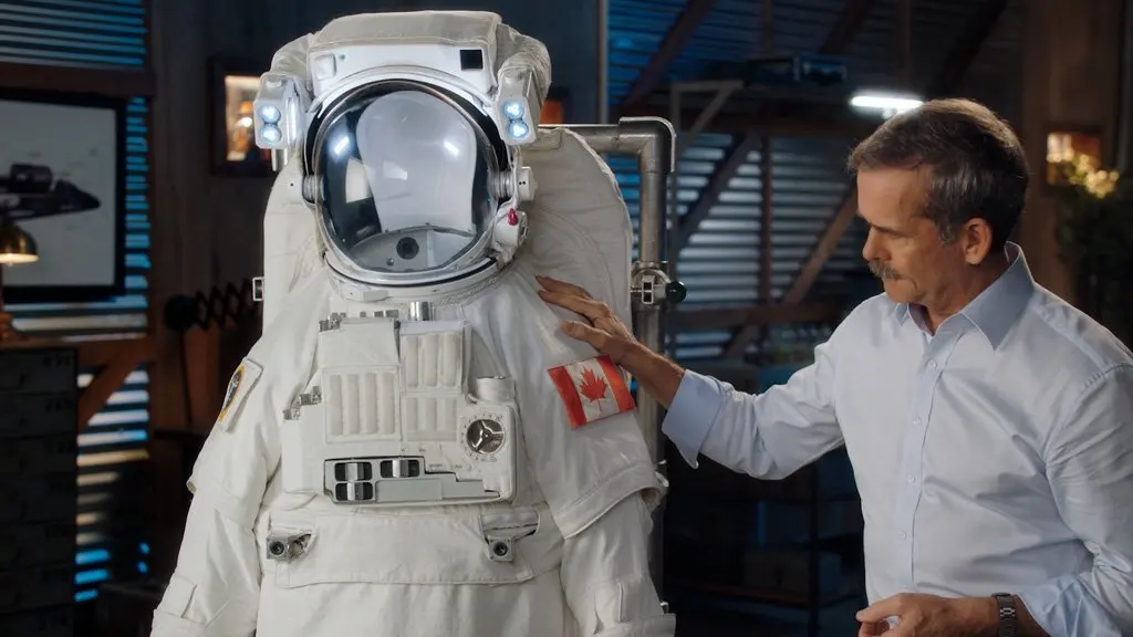 Chris gives a head-to-toe tour of an EMU (Extravehicular Mobility Unit), explaining how it keeps astronauts alive while spacewalking and conducting work outside the ship.