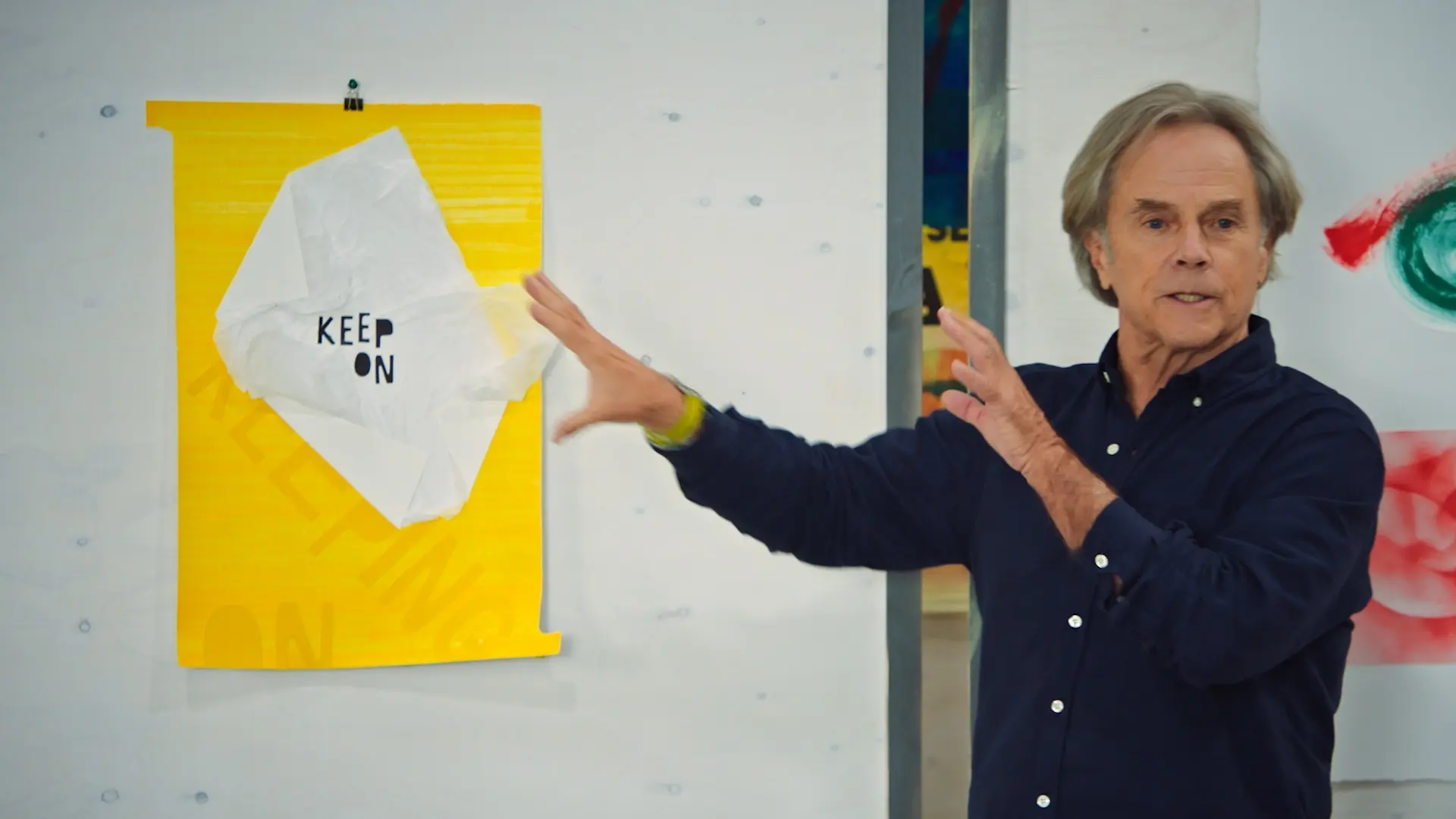 [MUSIC PLAYING] INSTRUCTOR: The first assignment, we looked at, who are you? And then we looked at, how is your life going? And now we're going to look into the future. Where do you want to be 10 years from now? Okay, how many would want this future? - Me. - Yeah, me too. - 1, 2, 3-- all four. Well, that's interesting. Why? JON: It's really optimistic, the use of color and the message. - The texture of the paper sort of like being on top and sort of wrinkled makes it seem like there's room for mistakes. - That's interesting, okay. - And don't take life too seriously, maybe. - Okay. - And you're willing to just keep on keeping on. - Okay. Yeah, it's pretty hard not to focus on the type. You know, it's repeated here. This may have been a bit-- a bit literal. Anybody not want this future? You can trade it for yours. This is guaranteed. Yours is unknown. This is for sure if you pick it. Would you go with that? - No. - No? Why not? - Not for no reason. Just, I want my future. - No, I'm sorry. You have to take this future. They didn't tell you at the beginning of class. What else? Anything besides-- I mean, it's clearly happy. But is there anything else there? HOFI: The sentence "Keep on" makes it seem like they're not happy all the time. - Okay. HOFI: But they're willing to keep on fighting. I wouldn't say it screams happiness. I would say it's a balance. - Good, I would agree. And the black is certainly contributing to that. And-- and so is this, actually. It's not a super happy kind of thing. Yeah, and then I-- and then I think-- and then I think-- I don't know that we get far there. Let's find out. Whose is this? - This is mine. - Okay. How-- how were the comments? - I think that more than it being, like, about me, I sort of made it, you know, to me. I think this is like my take on, like, a little self-help poster. It's like hang in there, but on a different level. But-- - So you took a little more of a-- which-- which, I like that-- kind of a mental evaluation of what might be going on as opposed to in the mountains, or the city, or the river, or something like that. So I like that. And again, none of these can be right or wrong. They're just sending different messages. I will say I think the type could have been a little stronger. It's almost too literal. I get it, and then I-- you kind of move on. So if we were to rework this, I'm feeling it's kind of placed there. And maybe there's-- there are so many interesting shapes and angles. Maybe there's some other way we could explore and make it feel less of kind of tapped on in the middle there. You're free to agree-- or disagree. You're free to agree with me. - No, I think that's a good point. - And I might even say, when you get up close, it says "keeping on." Maybe that's all it needed. This is pretty nice. This feels like it deals with ...