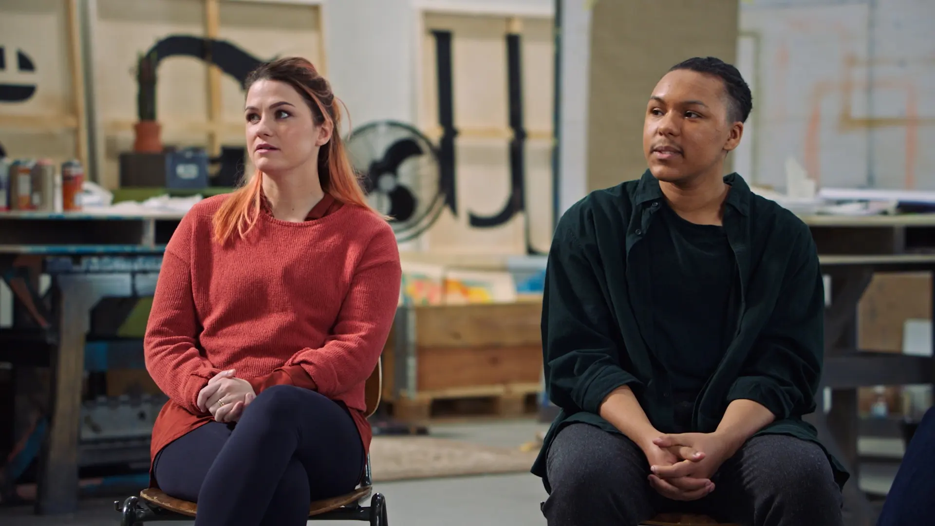 [MUSIC PLAYING] - For the second assignment, let's see what happens if we add color. Color is a huge message sender and emotion sender. I want to get a sense of how things are going in your life right now using only color. No letters, no words, and just a little peek at the power of color in your design. Let's start here. And what do you think's going on in this person's life right now? It seems a bit chaotic. - Yeah, I agree. - I think so. There's a certain amount of organization here. It's not out of control chaotic. - There's opposites involved that are playing off each other with the colors and with the textures. - How do you think that would manifest? - Maybe some emotional highs and lows lately. - Okay, having some highs and lows lately. All right. What else? Is this person happy or sad right now? - It's kind of hard to tell. - Yeah, the color seems happy though. - Generally orange, and especially lighter blues are happy colors. They're festives. Why, what's keeping us from that? - Just sort of this rough energy. - And what's making you say rough energy? - Maybe the nature of the brush strokes. - Yeah, the scribble. - Doesn't seem like it was done delicately. It feels like it was done with a lot of energy. - And what about the way these things are cut out? - They seem ripped more than cut out. - Would this indicate to you maybe things are going smoothly or maybe not so smoothly? - Not so smoothly, because of the edges and how it's, like she said, ripped instead of cleanly cut. - It makes a big difference whether you cut something out or you put it on a grid or you tear it. It sends a very different message. Overall, how many would say they'd want this going on in your life right now? - I don't know about that. - Why not? - I think the lack of predictability. Like it makes it interesting, but it also is a little bit like nerve wracking. - Yeah. - Okay. So is this person like in a really bad place this week? - Not if they know what to do with that energy I think. - I don't think we can say, oh, having a horrible week, okay? I think if it was dark reds and dark blue and some other colors. Who's is this? - It's me. - How were those comments? - Really true. - Really true. - Yeah, yeah. I have been feeling both happy and sad and stressed. - Happy and sad, I think that comes through. - Yeah, and stressed and juggling. - Stress. - Many things, yeah. - Was anything completely wrong that you heard? - No. - Oh, so they're right on. So this is communicating a lot, and pretty accurately from our comments. So the only thing I could add to that, is that when you did go in with a, if this was a book cover about your life or a poster about a talk you're giving, with the right words and the type, this becomes very powerful. Oka...