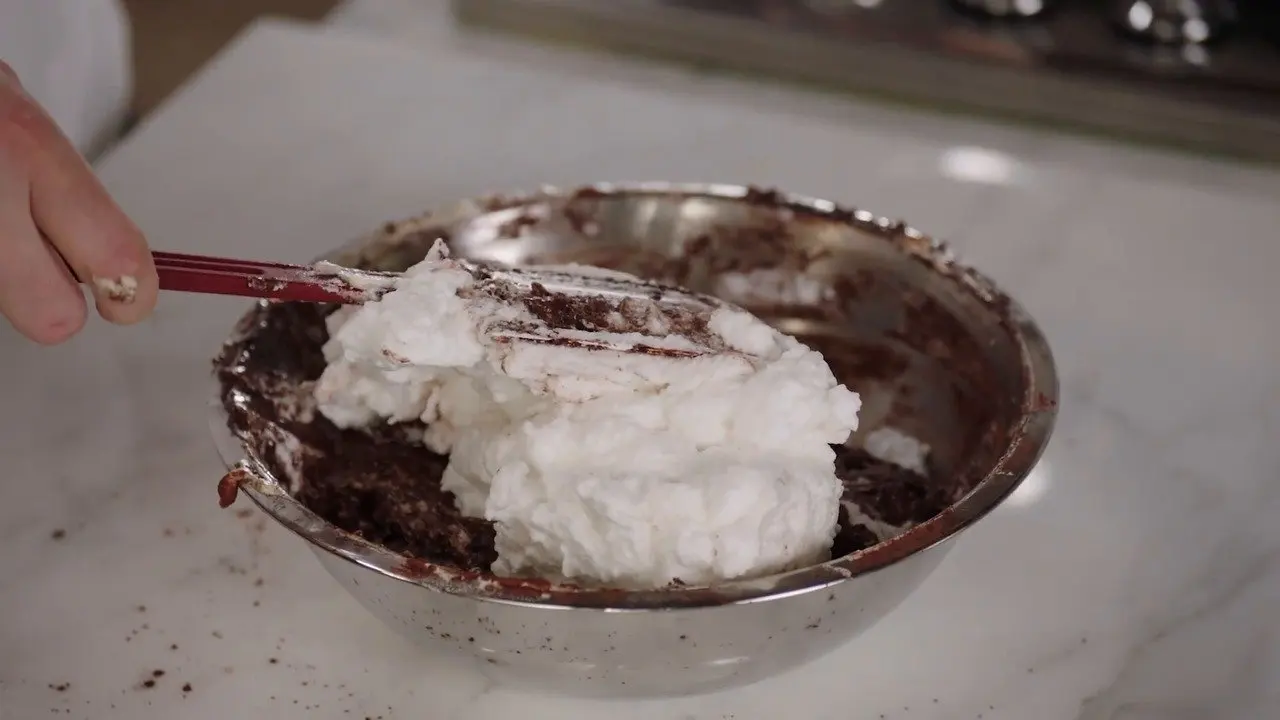 This is a classic French sponge cake. I love this cake because it's flourless-- it's a lot lighter. It's different than any classical American cake. We are going to build our-- what we call our mini me cake-- mini me for miniature meringues. It's a little more intricate, it's a little bit more delicate, and I'm going to show you how to assemble everything together. I'm going to show you how to make our chocolate cake. It's one of the first cakes I actually made for the bakery when we opened seven years ago. So just a few ingredients. Once again, everything's prepared ahead of time. We have our yolks and sugar that we're going to mix into the mixer in very high speed to have something very light and fluffy. I'm going to bring this up and add the sugar little by little. So now we're done with our yolks and sugar. They've been whipping for a few minutes, and as you can see, they'll be like very light and fluffy and it'll be like almost like you're-- like a ribbon. So the texture should be pale, very pale. It goes from this dark yellow to this very pale yellow. And the reason why we're whipping so much is to make this biscuit, this sponge cake, very fluffy and very light. We'll then place this yolk mixture into a larger mixing bowl, which we'll use to mix the rest of the ingredients. So this is our first step. We're now going to make a meringue and then combine everything together. So we now have our clean mixing bowl. Very important-- really, really dry for the meringue. So the meringue is very, very delicate. Those egg whites and sugar-- two simple ingredients. We want to make sure everything is clean and dry before we start. We're going to start with just the egg whites. So make sure there's nothing inside-- no shell, no egg yolks, and you'll have a proper meringue that whips very well. So if there's just even like a tiny bit of water on the side, it won't whip very well. We're going to use a whisk. I always use a mixer-- I don't ever do it by hand. I'll get tired before I can even whip them. So just try to do the same at home. We're going to start with the egg whites with a whisk attachment, and then we'll start adding sugar only when the meringue gets light and fluffy-- when you start seeing this white, foamy texture on the surface. And that's very important, because if you add your sugar too early, the egg whites are going to be too heavy, and therefore you're not going to be able to whip it as well. It's when I start adding my sugar. So little by little. So our meringue is finished here, and what you're looking for is for something that is like very light and fluffy. I always compare it to a shaving foam, so a thick shaving foam-- that's what it should look like. Once you stop the meringue, make sure you don't stop at all. Keep on stirring. We want to prevent the meringue from setting. If you leave it in a bowl and you wait a few minutes, the meringue will be clumpy and will have pieces. So what I do-- I fold the meringue...