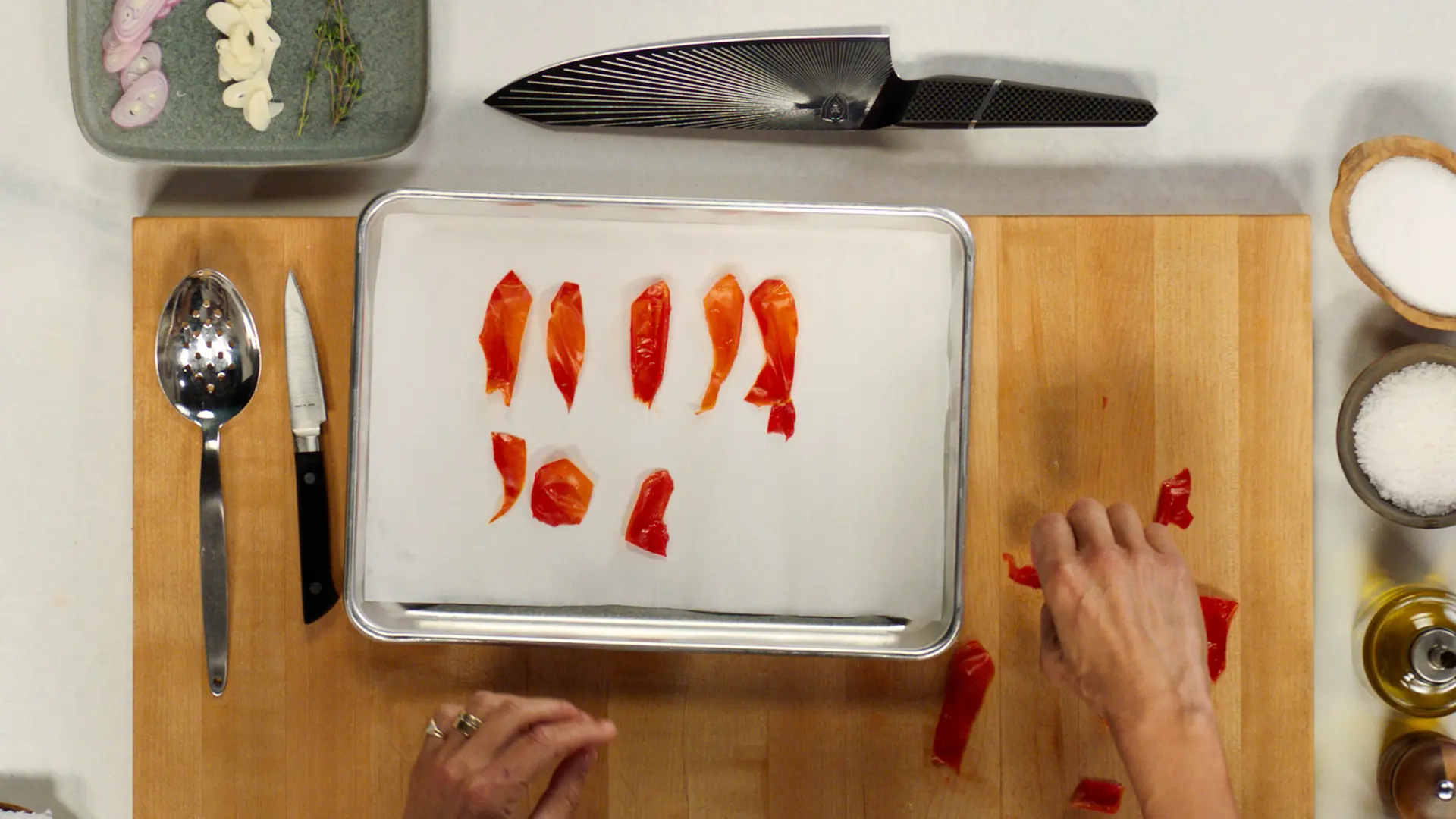 In the sunlit garden, are ruby treasures of the Earth. [MUSIC PLAYING] The first time I ate a tomato, I was, I don't know, maybe four years old. I went down to my grandmother's garden, and I picked up a tomato from the garden. And I think I've done it many times before, but that moment stay with me forever. I just pick a tomato, put it in my mouth, like I was eating an apple. And then suddenly, it just-- the layering, the flavor, it was just an explosion of flavor. And I felt different. Tomato is one of my favorite. Could be a vegetable, it could be a fruit. And it is just something that I love to cook with. So today, we're going to bring you a little bit of my recipe and my love and my memory to these dishes. What's beautiful about it also is you're going to learn more about the tomato. It's just not just a regular tomato, which usually often look like red and just kind of run like this. But you have like different color. You get the heirloom. You get the-- I mean, it's just fantastic, from black to yellow to red. And it's just an array of color and different tastes also. So I want also to talk a little bit about tomato and seasonality of the tomato. Growing up in France, often we have tomato during the summer. That's when we could eat tomato. I remember when I came in the United States, I was a little bit confused about that tomato was available, you know, year around. So I want to make sure. I just want to make a point, tomato, it's a summer vegetable or fruit. So make sure that when you want to do something with tomato, make sure that you go into the farmer's market, you talk to your farmers. If you want to can tomato, buy a lot of tomato during the summer, and then you can use them during the winter. But the best tomato, I offer during the summer. Seasonal is very important when you do a recipe. Just choose your product at the time the product is at its peak. You can use them raw. You can roast them. You can pickle them. You can make sauce out of it. You can grill them. You can ferment them. You can make beautiful tomato water with it. I mean, this is the ultimate vegetable/fruit that you need to have on your pantry, but seasonally. In this and following chapters, we are going to make three stages of a tomato dish that you can progress with, along with other beautiful vegetable-forward dishes. Now, we are going to enhance the tomato. This version is great for those who have limited time but still want to make an impressive dish. We will dehydrate a tomato skin and flesh to make petals, then make tomato powder. We will plate the petals, sprinkle them with the powder from the skins, and garnish with seasonal herbs and flowers. You can make a beautiful plate with these components or eat them as a snack. [MUSIC PLAYING] So we're going to start with doing petal. What you want to do is, literally we want to dehydrate the skin and the flesh of the tomato, marinate it in a little bit...