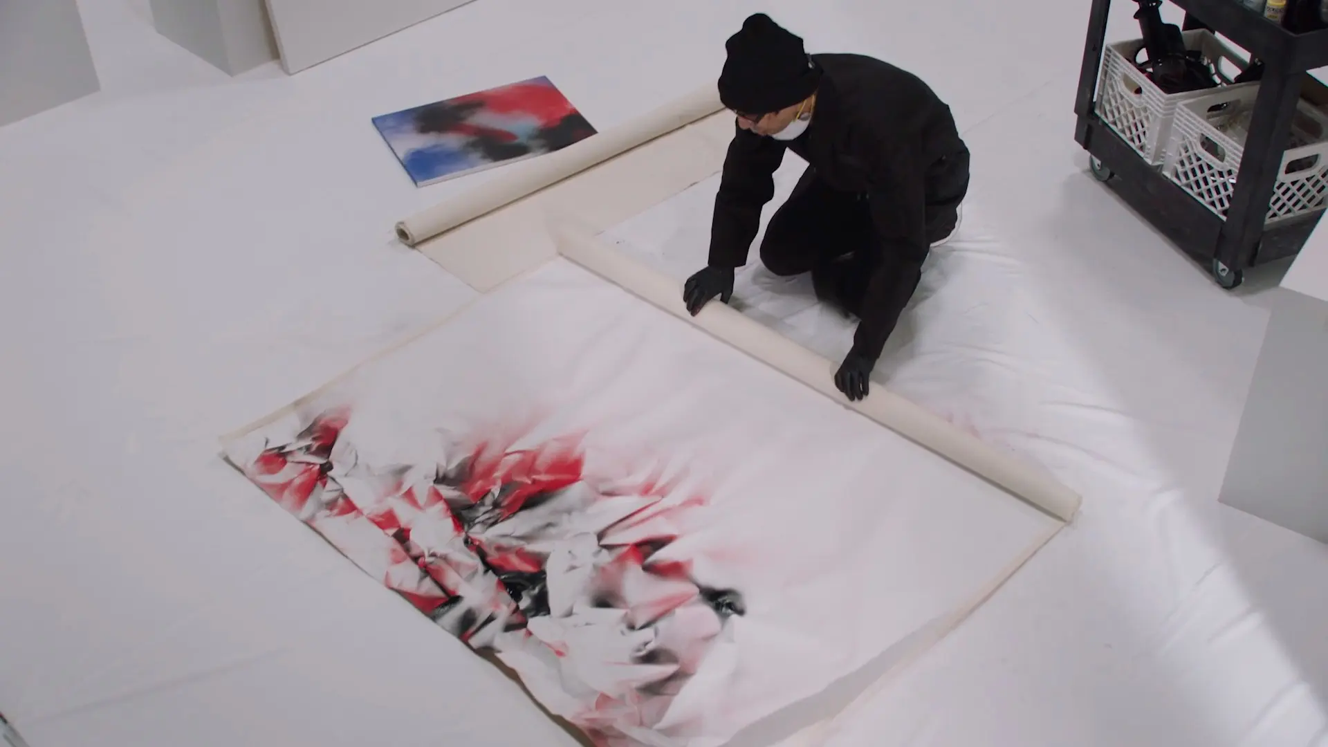[MUSIC PLAYING] - OK, so we're going to have a quick set up on our canvases here. What is a canvas? What type of canvas? We have some stretched canvases here. We also have some unstretched canvases, which I like to start with. So what's the difference, stretched, unstretched? Well, this is not stretched, i.e. meaning it's not on a frame, it's not on a stretcher bar, it's not on any kind of a chassis. Of course, this would be a classic stretched canvas sold in any art store. Or we could have made this ourself from the primed canvas. Simply create a wooden frame, crossbar, staple, staple, staple. You would have a non-store bought frame, but something you would make yourself obviously. And for many years, when you're at the beginning of it all and you don't have the funds or the resources to buy high end materials from an art store, well, you can buy raw canvas, cheapest. Stretch it yourself. Still cheaper than buying something store bought. And then prime the cameras yourself. So from a real DIY way, anything you see that's kind of traditional and store bought, we can all do this at home as well. So I'm primed, primed. And both canvases have different applications. Unprimed canvas can obviously become primed canvas. Just a question of applying the medium, the primer, the gesso. Or unprimed canvas can be kept as unprimed canvas. I happen to like both. I recently did an exhibition which was primarily on unprimed canvas. And that was a lot about how the effects of spray paint interact with a canvas that's not stretched. A lot of saturation, very wonderful techniques. I want to show you guys something that I used to do, something I learned probably when I was in high school. This can be done with paper, fabric, just about anything, clothing. Almost makes you think of tie-dying, which I guess is where it comes from. So this is a quick little demo. Because I have a can of red paint here, we're going to start with red. So what I've done is, I basically bunched up this material. But what I've done, is I've also created all of these cavities and crevices and chambers. All those folds are going to be wonderful. So I'm going to paint it from this side just like that. And as a result of the way it's folded, and once again, it's totally arbitrary. It's nothing preplanned here. It's just go with it. And this side has been painted red. I'm going to try this and paint the other side black. All right, it's pretty basic, but. So just on the strength of an effect, it's pretty interesting. And believe it or not, this is another accident waiting to happen for me in that I wasn't trying to make a tie-dye anything. I just did what I did there. I bunched up some material and I sprayed it, conscious of knowing if I spray something from one side and I spray something from the other side, you will create this kind of meeting in the middle. And what I love, is the way the shadows of the wh...