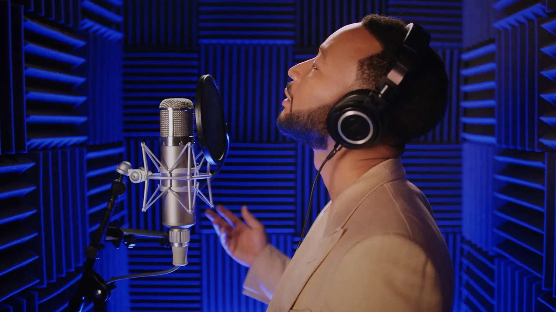 JOHN LEGEND: (SINGING) Go down, Moses, way down, Moses. Welcome to the vocal booth. We're here. We have a mic. We have headphones. We have padded walls. All of these things are here to make sure that we isolate the sound that you're making with your voice, so that no other extra noise corrupts that. So you can hear exactly what you're singing, and also, later be able to manipulate it individually rather than as part of an entire recording. So we're going to record the vocal, lead vocal, and backing vocal right here in this vocal booth. So what's in the vocal booth? What am I using? Really, it's as simple as the microphone and the headphones. Usually, when you have a headphone set up, you have some sort of controls for your headphones. Some are just volume controls, where you want it louder, or you want it softer. Some actually allow you to mix the levels of the instruments, or your voice, or the click track or the drums, or whatever other elements are in the song. It allows you to have some control over that mix. So we have a microphone. We have headphones, and sometimes, we have a little, tiny mixing board for our headphones. So we can control our own levels. And then after that, have what you want in there. I like to have water. I like to have, sometimes, some tea, depending on how my voice is feeling. SPEAKER: All of that said, you don't need a professional vocal booth to record your vocals at home. Find a room to make the best sounding recording you can and make sure you can communicate the content of your song. JOHN LEGEND: And you can still through engineering and all the other things make it sound good, but I guess the ideal circumstance for recording vocals is in some sort of booth. But don't let that stop you. (SINGING) Yeah, yeah, oh. I think everyone should warm up before you try to record a song, before you try to sing any time. I even warm up. When I'm on tour, I warm up before my interviews, because you have to get your voice used to working. And particularly, when you're singing a two hour show the night before and you've got to do an interview the next day, your voice is kind of tired and a little beat up. So you've got to warm it up so you're ready to vocalize again. So what I usually do, sometimes, I'll do a live video chat with my instructor, and we'll do, like, 45 minutes to an hour, where we warm up. And we work on specific vocal techniques. And then, a lot of times, I don't have the time to kind of schedule with him, but I'll use the recordings that he sends me. And I'll listen to him in my car on the way to the studio, or I'll listen to them, while I'm taking a shower and sing in the bathroom, while I'm getting dressed. But either way, I want to warm up for, at least, a half hour prior to recording any vocals, prior to me writing, prior to me going to the studio for that day. So some of the things we do, usually, I'm listening to him tell me to do it, and then I s...