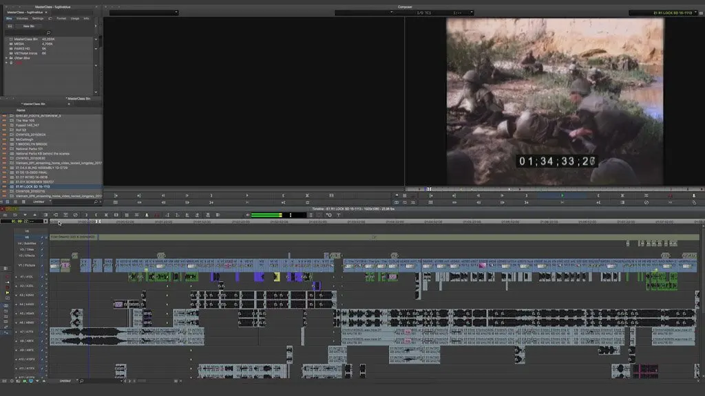 In order to help you understand a little bit of the tricks of the trade of editing, what I think is the most important aspect of what we do, I wanted to invite in one of my editors. Dan White, who's been working with me for 17 years, is a tremendous editor. We're going to do something that we've actually never done before, which is we're going to take you back and recreate, collapse four year-- and a half years-- of editing and sound editing and onlining into a few minutes of discussing how we got from the first blind assembly to the finish of the introduction. The first eight-plus minutes as it is in the final version was probably 28 minutes in our blind assembly of the opening of our film on the Vietnam War. We've never done this before, and we're happy to share. It was sort of lifting up our-- you know, showing our slip here. [MUSIC PLAYING] I want to sort of parachute into my own process. It doesn't necessarily have to be your process, but our process involves doing a blind assembly before we really start committing pictures. The simplest thing in a blind assembly, and particularly for the introduction, is you want to be able to enter your film right. It's a radio play, and you're essentially asking for what the dramatic structure is. We start off with a very, very complicated Marine named John Musgrave, telling his story of being out on an outpost, you know, terrified of the dark-- so much so that now, to this day, he has a nightlight. - And I'm scared of the dark still. I still got a night light. When my kids were growing up, that's the first time they really found out that Daddy'd been in a war. - He's relating it-- we just thought that was great, and it is great, but it had to be used once we'd established something. And so we're missing what it is, and we know we're missing what it is that's going to begin our film. We're going to keep him there for three or four more passes at least, maybe a couple of years that he's in there, but we're not all quite sure. He's-- he's got jump cuts in him, because we haven't cut it. And then we begin our narration. So it's all-- it's over black. America's involvement in Vietnam began in secrecy. It's my voice. Remember, I'm the scratch narrator, so it's not Peter Coyote yet. We're not going to bring him in until the very, very end. It was undertaken in good faith by decent people out of fateful misunderstandings. Then we go into the dramatis personae. We have a sequence of heads that we just piled in-- it's two and a half, three pages, of talking heads, of people we thought might work in this sequence. They do work in the context of introducing themselves and introducing important ideas that we hope the film will do, but they're not going to serve an introduction in the film. And so every single one of them but two went out of the film from that introduction. So we are experimenting with things we're familiar with-- the dramatis personae, which was very much a part of what wa...