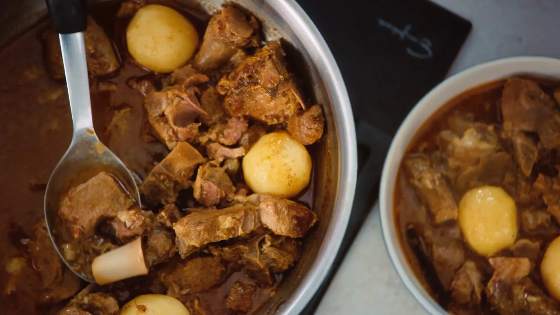 [MUSIC PLAYING] - Indians eat all types of meat. And what I'm going to make today is one of the many meat dishes we eat throughout India. You might call it a goat curry. I would call it aloo gosht. [MUSIC PLAYING] In India, those people who eat meat at all will eat goat. That is the common everyday meat. And when we go out to buy goat, we pick our pieces, because we want whatever we are making with it to be as tasty as it possibly can. So what we ask for, we ask the butcher can you give me some beck. Now this has bone in it. We like bone. We like the meat that surrounds bone. And can you give me some shoulder? But they'll be a bit of leg. And what I often love is a bit of the shank if they'll give it to us, because shank meat is delicious. But there's one thing that we as children just fought for every time the meat came to the table. We said, who's got the marrow bone? Who's got the marrow bone? Because there usually was only one marrow bone. And even for those who don't want to eat the marrow, it's the flavoring, the richness that it gives to this sauce of the meat that makes it the best tasting thing in the world. So we want a marrow bone or two or three, as many as you can get inside the particular dish that we are making. Now what I'm going to make for you today is aloo gosht, and this particular dish is from Pakistan. In Pakistan, a lot of the vegetables are eaten with meat. They're cooked with meat. So what I'm making is potatoes and goat meat. So to start with, I'm going to put a little oil. This is medium high heat. You need 4 tablespoons of oil. Now remember, you need the oil. Otherwise, you won't be able to fry the meat the way it needs to be fried. This is very important. If you have extra oil, you can take it out at the end, but put it in to begin with. Otherwise, the meat just won't fry and brown properly The way you want to. There's a word in India called Bono, which is the act of Browning, and that concentrates the flavor of the meat or of a vegetable. And this is essential at some stage. Now some people do it early on. Some people do it later. Now I'm going to put into this hot oil some cinnamon and some green cardamom pods. And what happens when you put hot oil and whole spices together, the spices give their flavor to the oil, and it's like a quick injection. The spice flavor goes right into the oil. These whole spices go into the dish and stay there, because people know that when they're eating they're going to put it to one side and not eat them. Next thing I do is put a whole red onion that has been cut into rings in, a whole red onion. Now I'm going to let this cook for a little while till it is lightly browned. All right, you might well ask, why she's doing a class on Indian food? Why is she talking about Pakistani food? Because here's the reason. India was one large country at one time. When I was growing up, India was-- Pakistan, B...