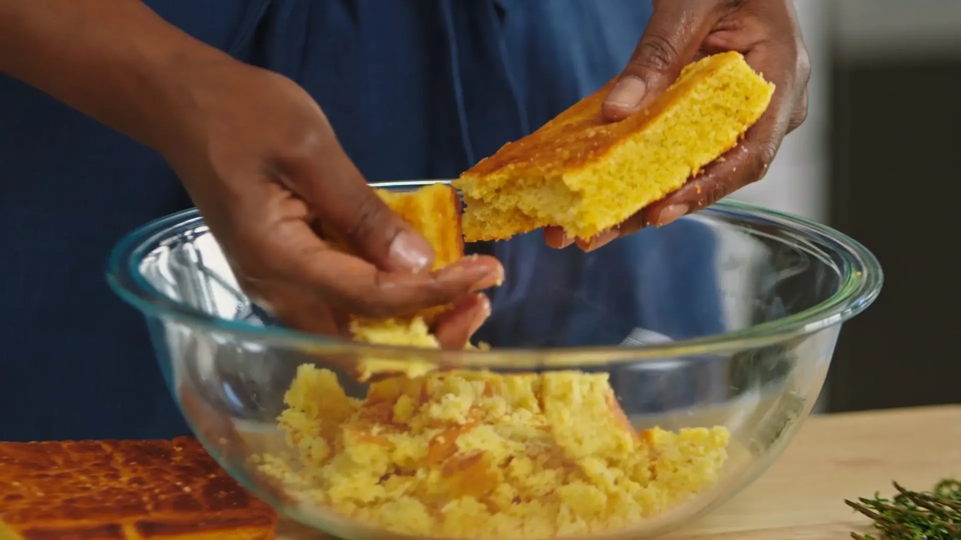 [GENTLE MUSIC] MASHAMA BAILEY: The reason why I'm doing this quail dish with cornbread dressing today is because it's a way that connects my ancestral cooking along with Black cooking in America, and it uses modern techniques that just elevate the whole dish. We always have cornbread dressing around the holidays, and we always have it with turkey, but you don't want to have turkey all year round. It's nice to have a little alternative to such a big bird, a seasonal bird. So you can have this cornbread dressing with the quail throughout the year. [GENTLE MUSIC] The first thing I'm going to tell you is we're making a cornbread dressing. This is a family recipe that I would love to share with you. It is one that every year I get better at doing, but it's something that my grandmother made for us and very few family members. My uncle and my mom really do a good job. I'm still learning, so this is a great opportunity to just let you know that we're always still learning. And this is the great part about life and great part about taking MasterClass, is because it's about elevating, and learning, and growing. So there's a few steps that you have to do beforehand in order to get to where we are right now. The first thing you need to do is bake off your favorite cornbread recipe. Bake it off. Let it cool. The next thing you're going to do is you're going to have some onions, some carrots, and some celery, and you're going to sautée it down. This combination is mirepoix. It's okay if it gets a little color. You want that. You want a little bit of caramelization. Once it gets to this phase, there's a little bit of color going on. Then you want to add some chicken stock on hand, and you want to deglaze your pan with the chicken stock. This is a chicken stock that we've reduced down, so it gives us a really deep, rich, chickeny flavor. Going to stir that in. Then the next thing you want to do is add some cream. So right now, we just incorporating the cream with the caramelized vegetables and making sure it all gets mixed up in together. We're keeping it at a very, very low heat, and this is going to act as the base flavor of this dish. We're going to add some fresh herbs, some thyme. You can also add dried thyme to this if you'd like. But we'll add four sprigs of thyme, that good old bay leaf that keeps us where we need to be. Stir and keep an eye on the heat. We don't want this to overflow. That cream is going to want to come up on you, so you want to keep the heat low. And as soon as you start to see it bubble up a little bit, you just want to give it a stir to cool it off. So now, we're going to move over to the cornbread part. We have our cornbread that's been cooked off, cooled. It's also been refrigerated, and we want to crumble it up. I like to do this with my hands. Sometimes you can cube it if you want and dry it overnight, but this is how my grandmother did it, so this is what I'm going to do un...