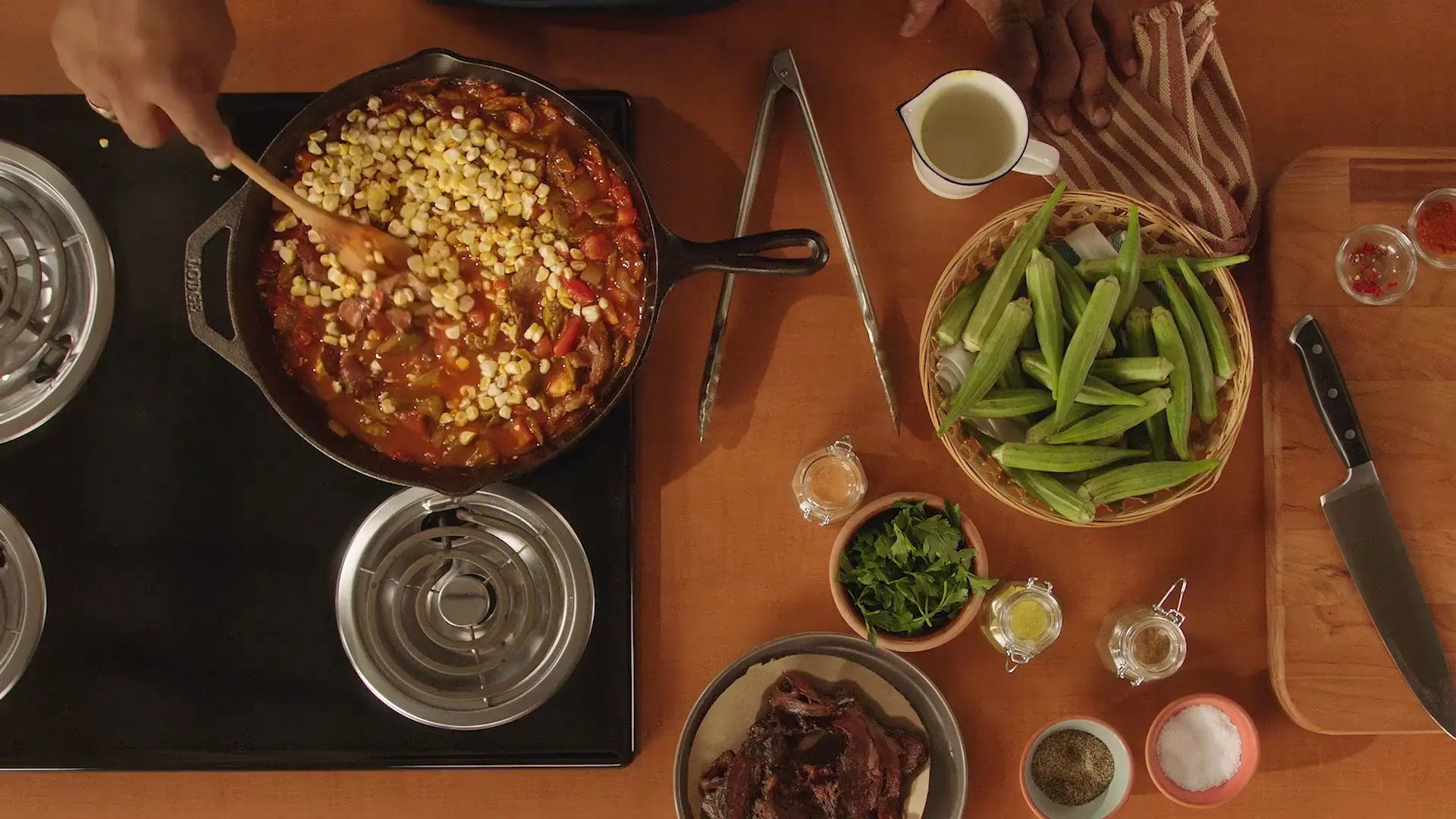 - What we're going to be making today is we're going to make okra, corn, tomato stew. This is part of that family of okra dishes. Now if you change a few ingredients, you get okra soup. If you change it a little bit more you get gumbo, but okra gumbo, because there's also a file gumbo. You change it a little bit more, you get limpin susan, which is okra and rice. Change it a little bit more, you get okra and black eyed peas. So there's a whole complex of dishes that involve okra. If you go to the Caribbean, you get okra and fungi, which is the cornmeal pudding that has okra in it. So there are all these dishes that combine the flavors of okra, onion, tomato, and pepper. And also of course, there's the corn. It's a very summer dish. And a lot of these foods that we're making really involve the seasons. We're going to start with bacon. Of course for me, it's going to be kosher beef bacon. And we're going to render it. So we can begin to build the flavor, even the fat that you use in this, if you choose to use meat is very important. If you don't, there are variations that we can talk about. But for me, I'm going to use the beef bacon, render it, get the fat out of it. Cook it for about five minutes. We're going to start there and build what some people might call a sofrito. And then go on to put in the tomatoes, make a broth, and then we're going to end up with what we call in our terminology a stoop, so something between a soup and a stew, but not really much of either. So here we go. So I'm going to take this beef bacon. I'm going to use my hands at this point. And you can see it's pretty fatty. And the whole goal is to really make sure that the bottom of this cast iron skillet is pretty coated. And we're going to use this in the dish. But for right now the main goal is to get all the fat out of it. For this, I'm going to go old school cast iron, which is kind of like what our ancestors had. they had cast iron pots. They had cast iron skillets. They didn't look like this. And they didn't have a lot. I mean, you would have had maybe those two things and maybe a lid, maybe a couple of wooden spoons. And that's why so many of the meals involved one skillet or one pot meals. One thing I want to stress about this way of cooking is that this is not part of Western culture. This is part of African culture, where you cook with your senses. You cook with your sense of smell. You cook with your sense of touch, your sensitivity to the heat, how things look to the eye. Obviously, we don't want to burn the bacon. But we also don't want to overdo it. So I'm only going to turn this as many times as it takes to really make sure that both sides, we have that grease leaking out. This meat here is not really there for any other reason than to be a condiment. It is not an entree. It is a condiment. And is there to flavor. It is not there to replace the vegetables that are the star of the show. And it's not because of ...