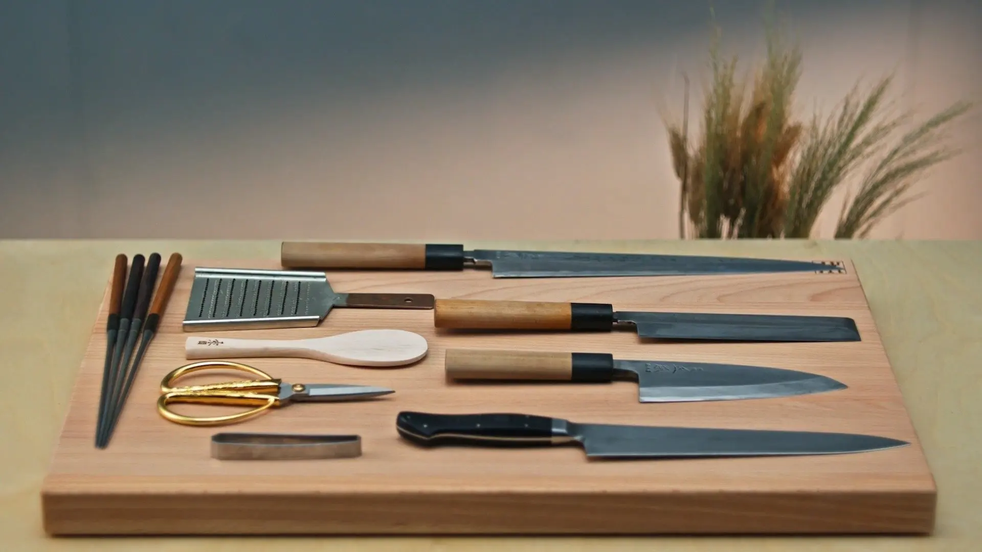 [MUSIC PLAYING] - So here we have our Japanese toolset, the things that we would use inside a Japanese kitchen. And they're really important, essential, because each one of them has a different usage. And they all make up what makes Japanese food really delightful in their presentation and helps with the precision and the execution of the dishes that we're going to make. [MUSIC PLAYING] First, I'd like to show you the knives. So as you can see, there are three different knives here. And the interesting thing about these knives is when you're learning to cook as a Japanese chef, the only knife you get in the beginning is this one here in the middle. This one here in the middle is called a usuba. And basically, it's a vegetable knife. So your number one rule of any type of Japanese training, professionally, is first and foremost, you need to learn how to cut vegetables properly. And plus, it's also one of the knives that are actually very intuitive in learning how to sharpen a knife, based on its shape. Next, you'll progress to a knife called the deba. The deba is a fish cutting knife. It has a really wonderful edge. And it's very thick and sturdy to cut through big fish and bones. And finally, when you've perfected that, you get to actually break down it even further to sashimi and sushi. And here we have the yanagi knife. The yanagi knife is, by far, the sharpest in terms of the way it can cut. It's also very fine. So one of the things that we look for when we're cutting sashimi is how fine that knife is when it cuts through the meat, so that it doesn't break down or tear the fibers of that fish or that product. And that's why the yanagi is one of the most important knives for sushi and sashimi slicing. - So the knives themselves-- the carbon that this particular yanagi is made of is one of the hardest metals out there. And that's what makes the edge retention on it so amazing. There's a lot of craftsmanship that goes into this to allow the sous chef or whoever is using this knife to be able to slice through the flesh of the fish in such a clean manner that you basically don't even feel it hitting the flesh. And the point of that is it kind of encompasses in its purest form what Japanese cutting is about. It's about preserving that natural ingredient. And the best way to do that is to have an amazingly sharp knife that just glides through the product, as opposed to pulling through the fibers of the fish. And I mean, we even talk about, like, the sheen that should be there if the knife is properly sharpened on certain ingredients. - Right. So for the professional chef, one of the golden rules with knives is that you must take care of your knives. They are an extension of yourself in terms of preparing this meal for your guests or your family or loved ones. And so you treat them with as much respect as you would an ingredient, meaning constantly wiping down. Because carbon does tend to st...