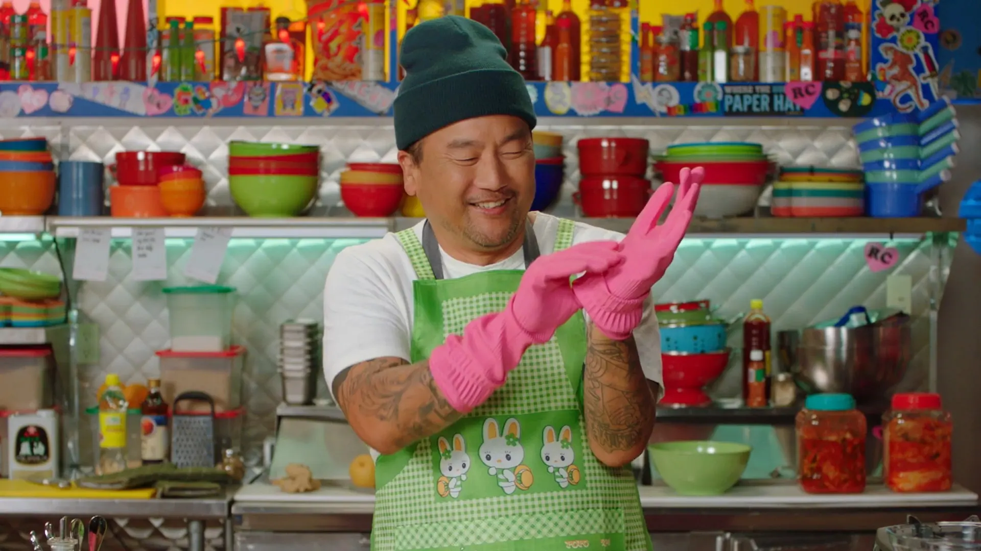 It’s time to get messy. You’ll need an apron for this one—preferably one with bunnies on it. Roy teaches you to blend kimchi paste and kimchi napa cabbage.