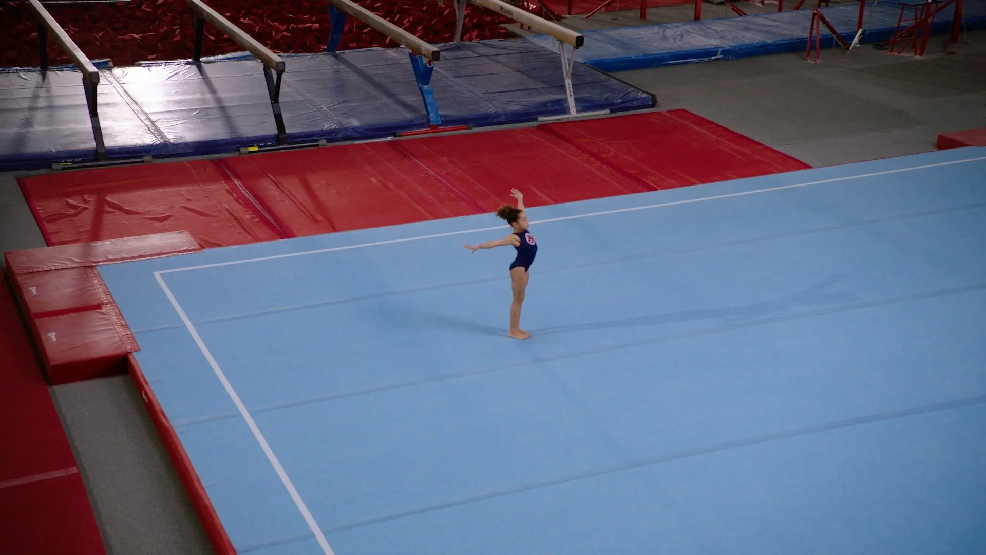 With help from nine-year-old Leah, Simone breaks down the basics of floor, including skills like cartwheels, roundoffs, front handsprings, pike fronts, and back handspring back tucks.
