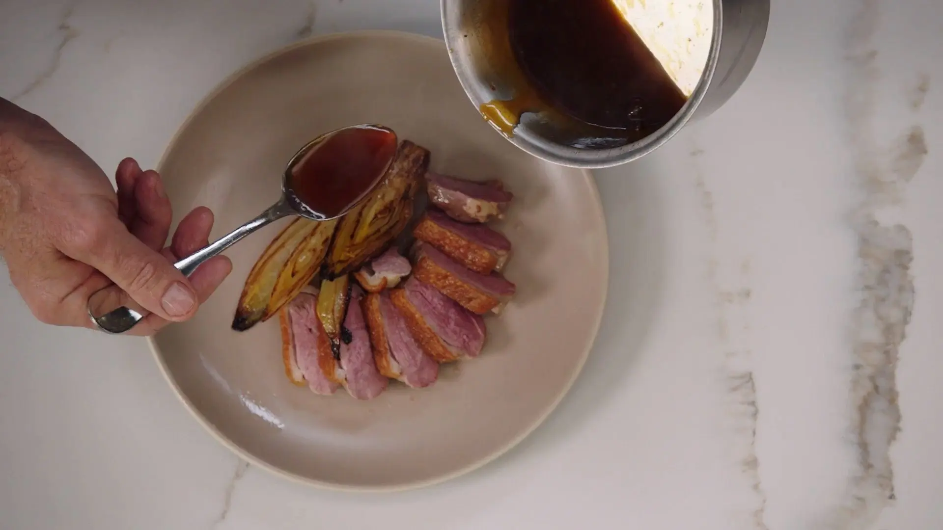 Chef Keller teaches you his pan-roasting technique for Pekin duck breast, including how to render the fat for a crispy skin and how to achieve the perfect medium-rare finish. Then learn how to make a honey-orange gastrique sauce for a sweet and sour finish.