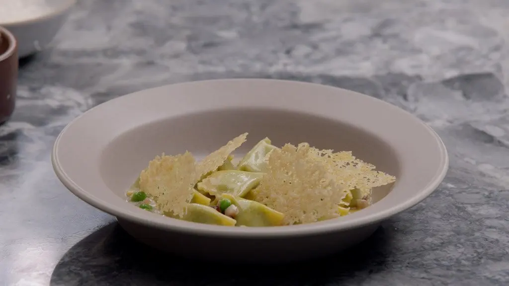 Learn how to make a composed dish with your agnolotti, complete with peas, bacon, and a delicate parmesan crisp.