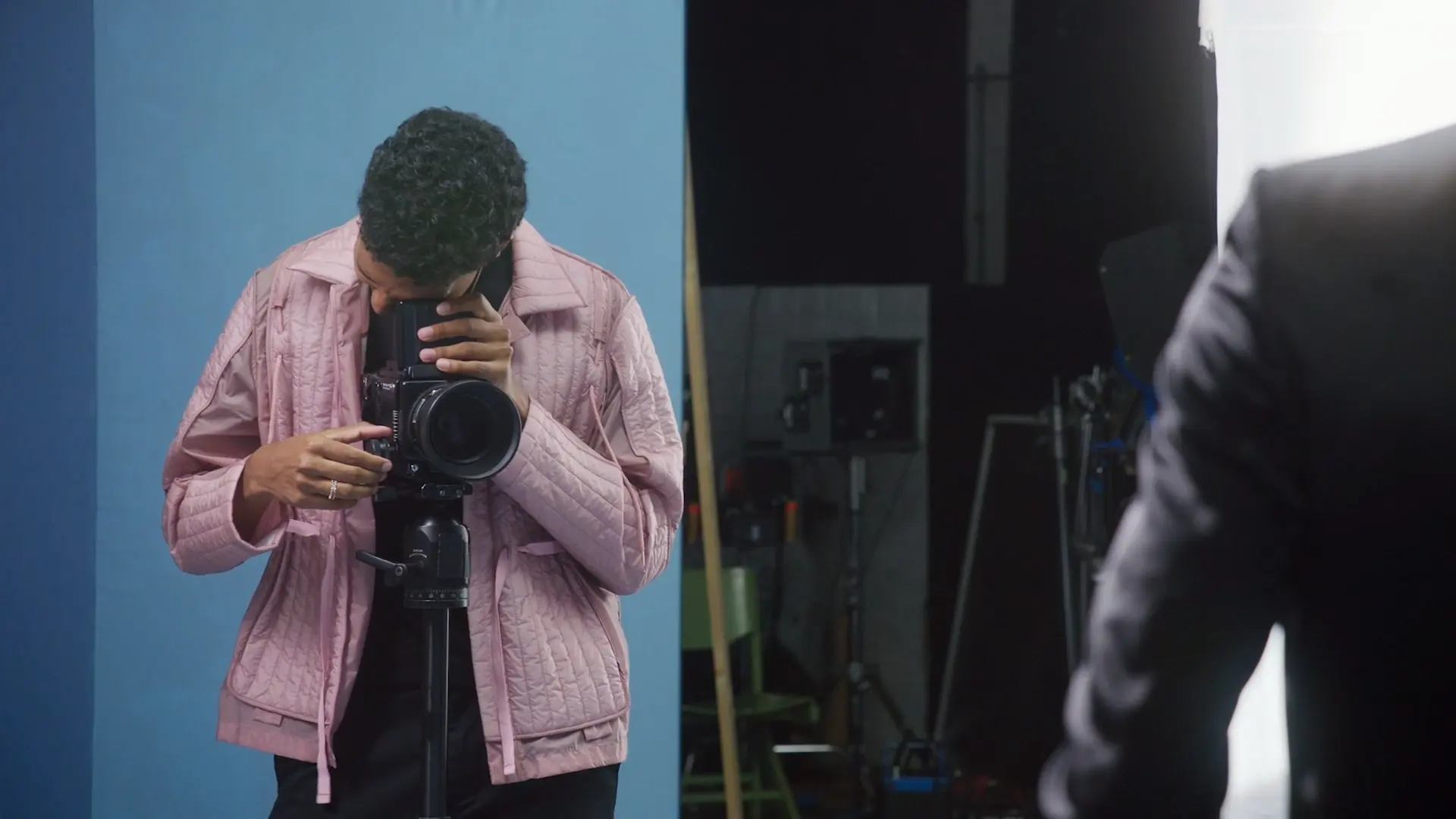 [MUSIC PLAYING] - Today's session is a studio lighting demonstration. I'm trying to make a portrait of two model friends of mine, Matthew and Toby. The whole idea is to make quite a nice simple studio backdrop photograph essentially a full portrait of the two of them, a double portrait. I'm going to be using my analog film camera today. It's a medium format camera. It's a Mamiya camera versus earlier when we were using my smartphone for the natural lighting demonstration. The principles of making an image are the same across the board, whether it's analog or digital. I mainly photograph my subjects on analog cameras, on film cameras. I love the heart and soul of the feeling of the pictures. It's like choosing oil or acrylic. It's a matter of taste. So if you like it and you're drawn to it, it's important that you make that process work. For me, what works is a more intimate approach with my models in that when you're shooting, you can immediately see your results. And there's something very freeing about that. So if you want kind of a more humanistic approach with your subjects, if you want something that's more in the moment that you can reflect on, film creates a nice process for making pictures. At the end of this chapter, we'll look at the developed film we've shot and see how it turned out. [MUSIC PLAYING] If you're doing a studio shoot, you'll usually have some idea. Whatever that idea is, it's driven by what you're going to build in the studio, because the studio is a blank space for you to work in. I have here behind me kind of a bit of a color story in that we've got different tones of blues for the wall, for the floors, and we're using different fabrics and flats. But you can kind of build with your team or with your crew, or by yourself, you know, whatever kind of set you want in a studio. The wardrobe choice was mainly an instinctive one. They're in these cool looking suits. I wanted to play with black and navies against the blue set. And mainly when you're choosing wardrobe, it's just about your instinct. It's about what feels good. I dress them in something that I'd probably like to see myself wear, but also something that I just like aesthetically. I really like the length of their clothes and I like the set behind. So I want to see quite a wide, full body. So I'm going to frame them up basically head to toe. I'm going to see everything here. And so if you boys take a little step back. When I look through the viewfinder, I know I can see head to toe here when I'm making a double portrait. My approach to using kind of patchwork styles of fabrics, blue backgrounds, choice of wardrobe, choice of subject, those are all my aesthetic inclinations. So when you're making your choices, they could look very different from this. [MUSIC PLAYING] Today I think I'm going to walk you guys through something more traditional, where you have a key light in front of the subject, a fill ligh...