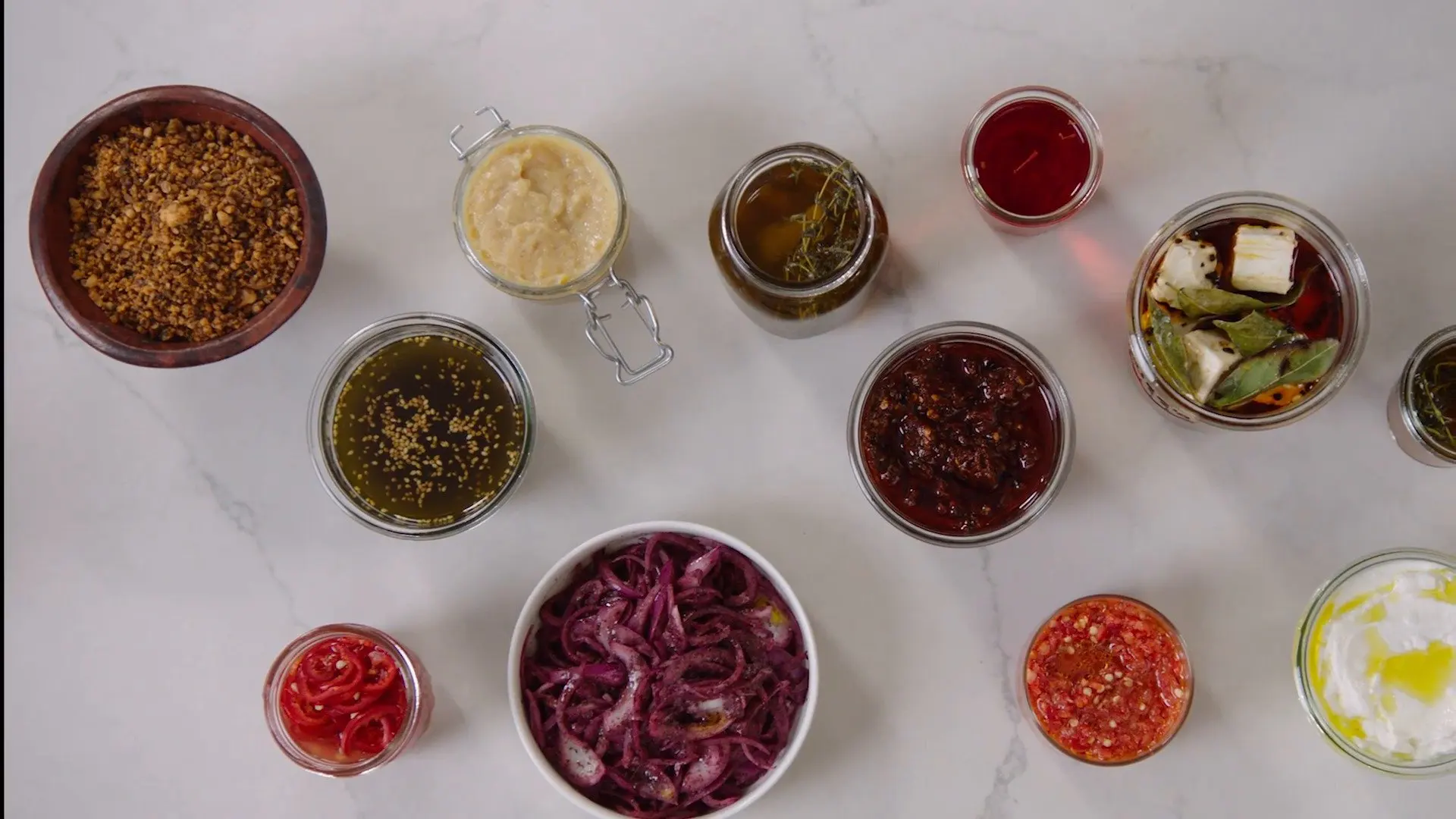 [00:00:00.00] [MUSIC PLAYING] [00:00:19.31] - So these are my condiments. They all come out of recipes that you will have cooked or you will have watched. But I just wanted to put them all together so you can watch how to make them because they're really powerful/effective as flavor bombs-- as I like to call them-- for future meals, for future dishes that you want to cook. [00:00:37.51] I've got dukkah here, for instance, which is an Egyptian spice and nut mix which goes over anything that needs a bit of crunch and a bit of spice. I've got quick pickled chili, another bit of spice. There's a lot of spice here. There's also a shatta, and there's also a harissa, two chili pastes, one quick to make, one involves a bit more work. There are some sumac onions that are really just sumac onion and lemon juice. That's for like a hit of sharp acidity. Something similar is my preserved lemon paste or za'atar oil, which is just to soak over bread with some fresh tomato to make you smile. I've got some saffron oil. I've got marinated feta with all sorts of aromatics. [00:01:27.01] All these things are ways for you to really lift your cooking and allow you to make things more special next time you walk into the kitchen. The condiments are really good because you can make them ahead, and they keep for quite a long time, from three days up to a few weeks. And they are there for you to inject flavor into meals at the very last minute. [00:01:49.97] So you don't need to think much. They're there on the shelf. You grab something. You take a spoonful. You add it. And you've got flavor instantaneously. [00:01:58.84] These condiments are so much better than what you buy in the shop or a supermarket for only one reason-- you made them yourself. And they have your own fingerprints on them, literally on the jars. So it means that the next time you pick one of those and add it to your food, you have added your own condiment with your own set of flavors that you've made yourself.